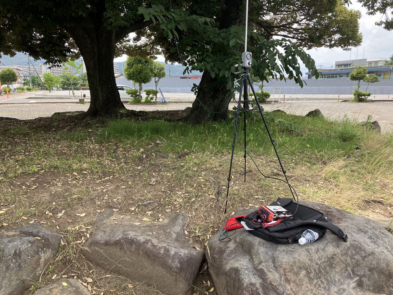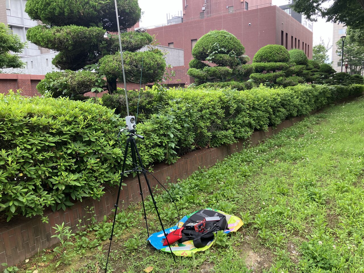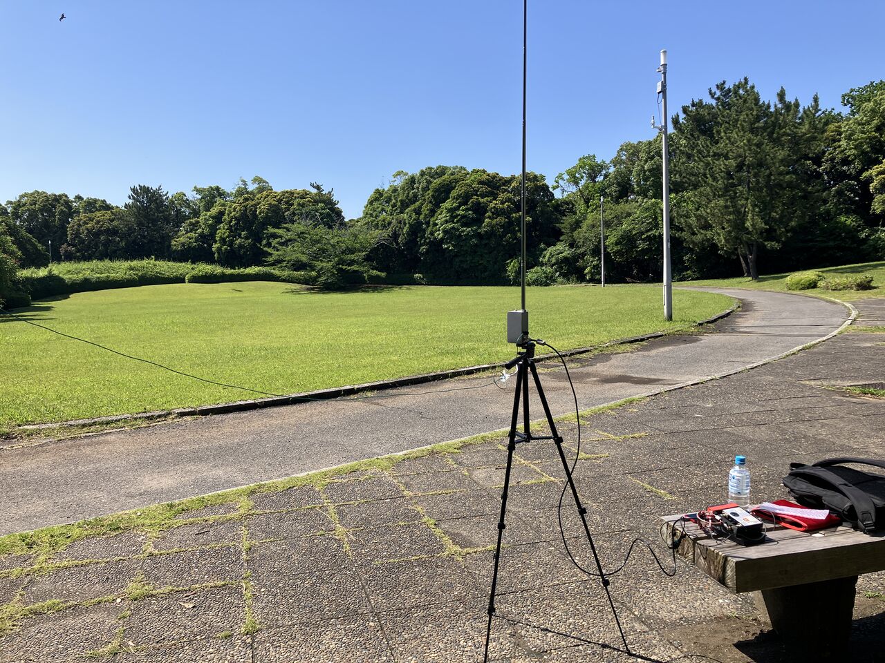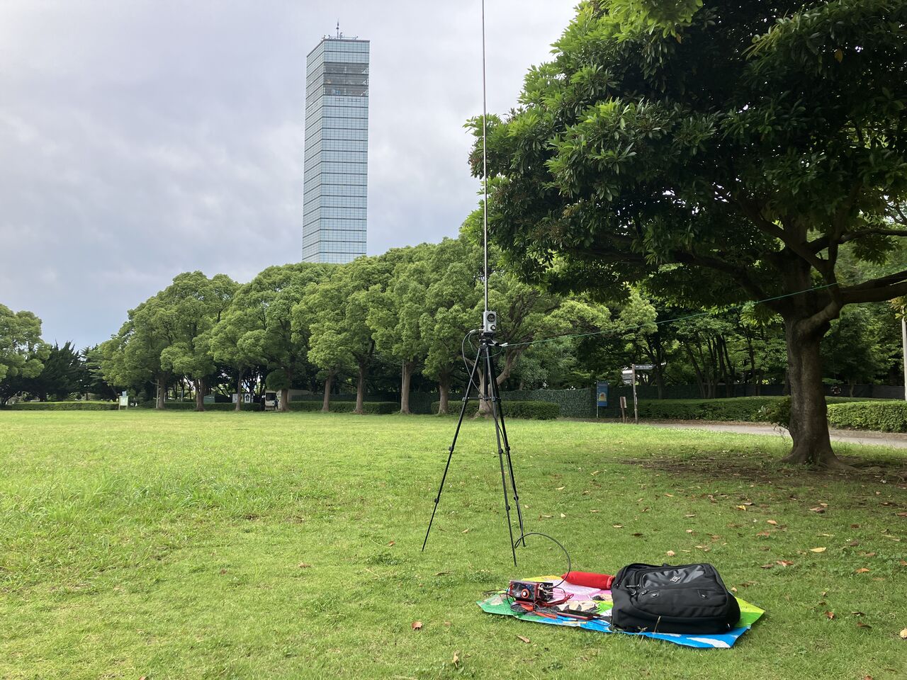 徒歩50分と長め。曇り予報と異なり太陽光線が強い中の街中歩きは結構大変でした。東口付近の日陰で運用セットアップ。ここで、地元のJA1ASDさんとEBでき、次の公園まで車で送って頂きました。暑かったので助かりました。楽しいお話、ありがとうございました。