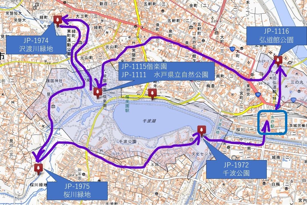 POTA公園とルートは以下の通りで、水戸駅から反時計回りで一周して戻るコースです。総歩数は2万歩となります(約10km)。