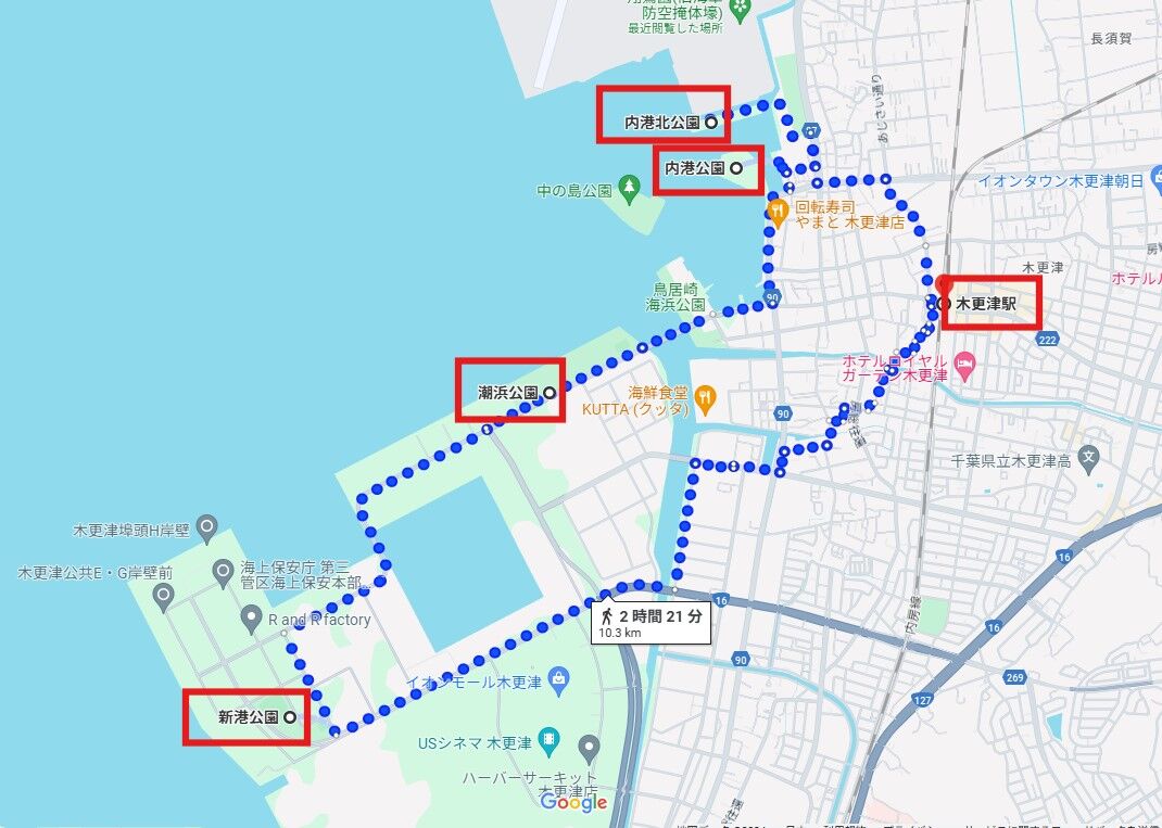 ルートは、木更津駅から徒歩で時計回りに計画しました。最初の元気なうちに一番遠い、新港公園まで4km歩き、あとは30分程度ずつのコースです。自宅からJR木更津駅までは2時間半かかりますので9時から運用するために5時半に出発となりました。コースの距離は10km少し、歩数で約2万歩となります。
