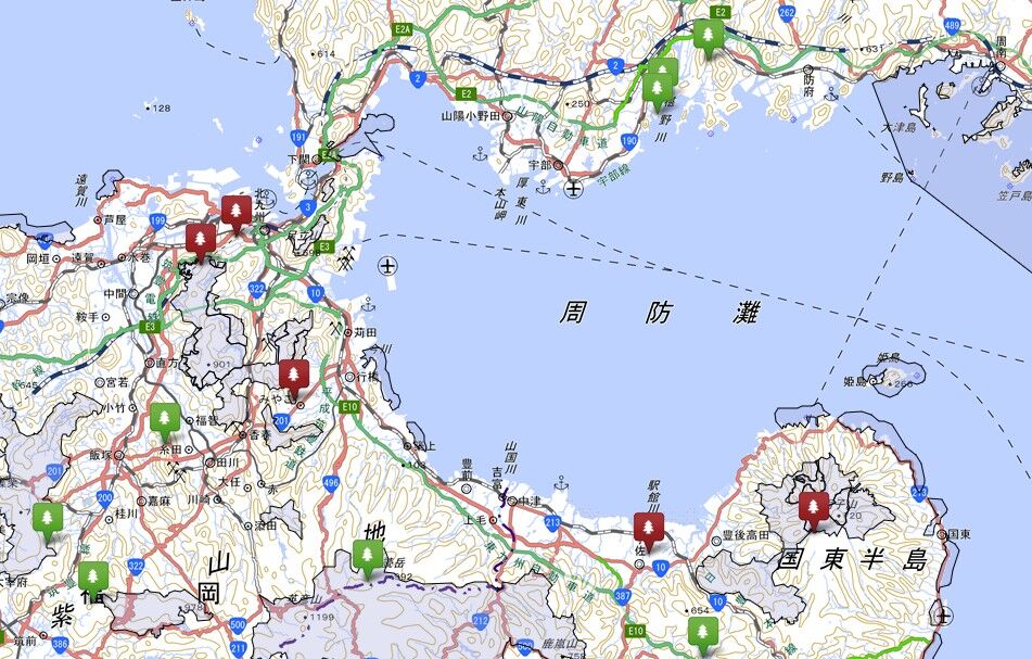 今回ACTした公園は、下図の赤色部分+関門海峡近くの瀬戸内海国定公園の福岡部分の計6か所(3/9と3/11の二日間)となります。
