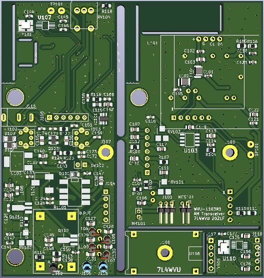 理由は、前回は送信スプリアスのみを考えて送信関連は一つの基板にまとめていましたが、PLL回路、受信基板が別の基板になっていたため、受信時の副次的発射レベルをクリアするのにかなり苦労したためです。