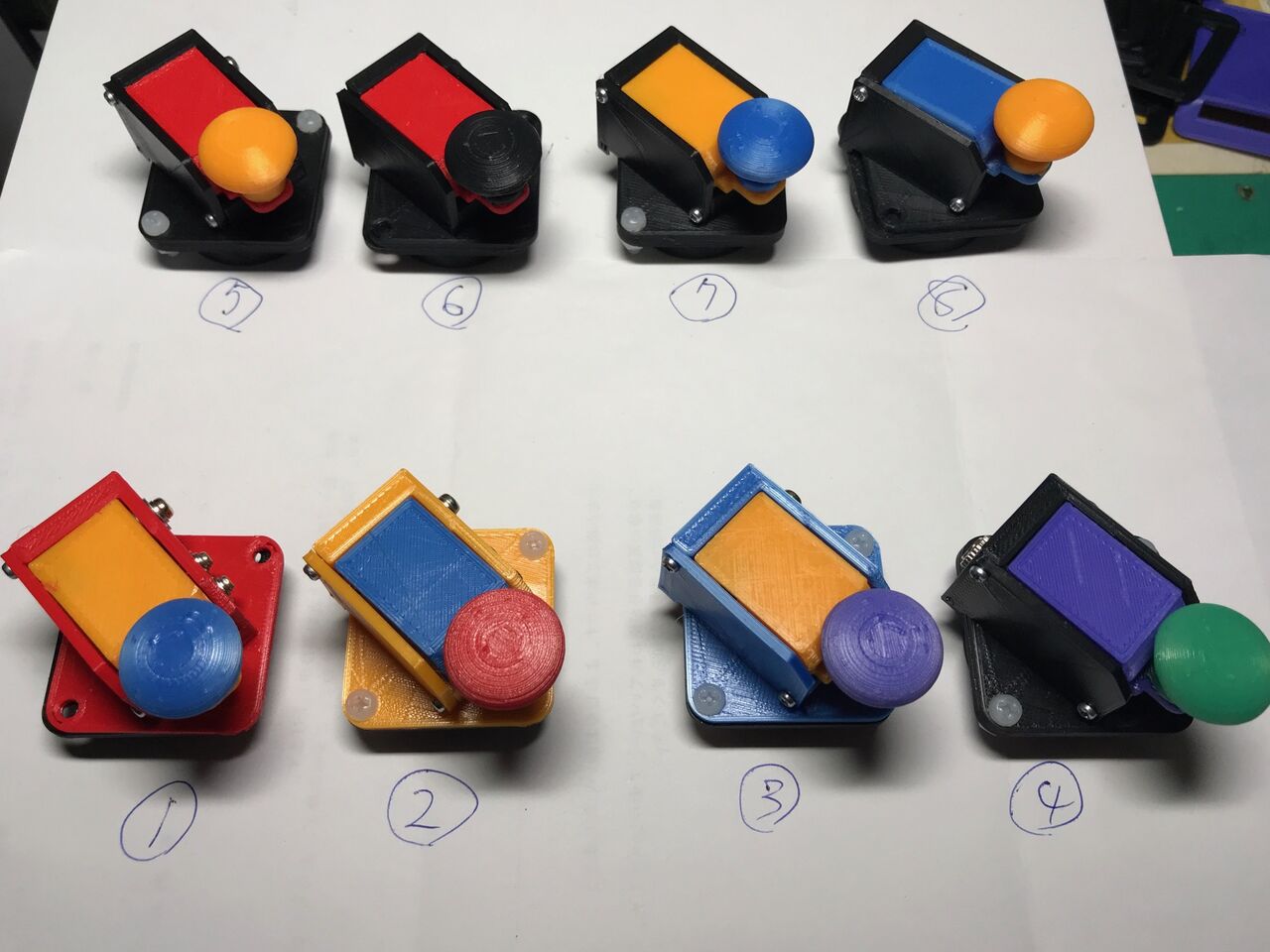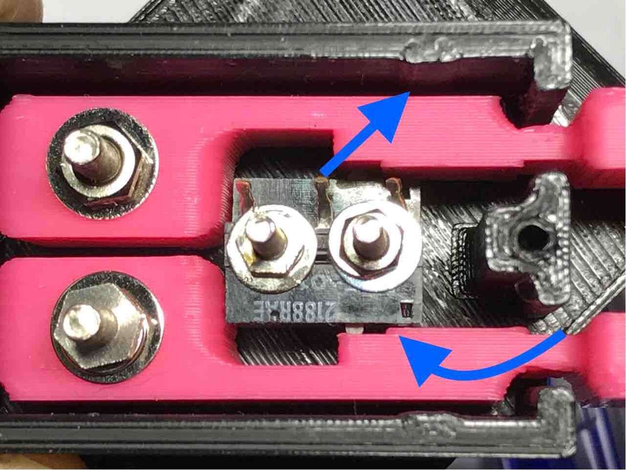どうしても押した時の遊びが長いと、高速で打てなくなりますので、段差をつけてストッパーとしています。下の写真の青矢印部分参照