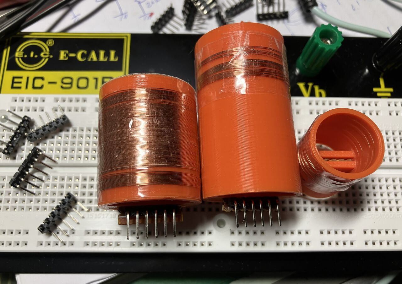 試作品のコイルは自在ブッシュを使用したコイルでしたが製作が面倒なのとコイルピッチが狭いためワニグチクリップでショートするために少し間隔をあけてコイル径を大きくし、3Dプリンターで製作することにして完成度を高めています。製作した部品はこんな感じです
