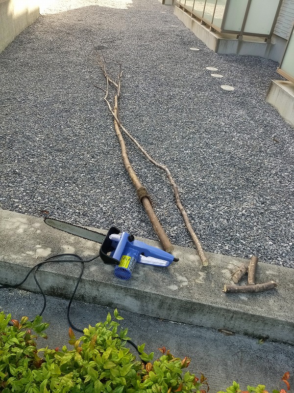 5年ぶりに電動チェーンソーを引っ張り出して、上を切り落としてみました。