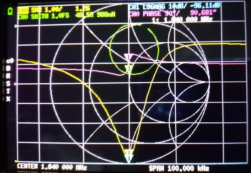 SWR 2以下の運用可能範囲は、1.835~1.845MHzの約10kHzです。