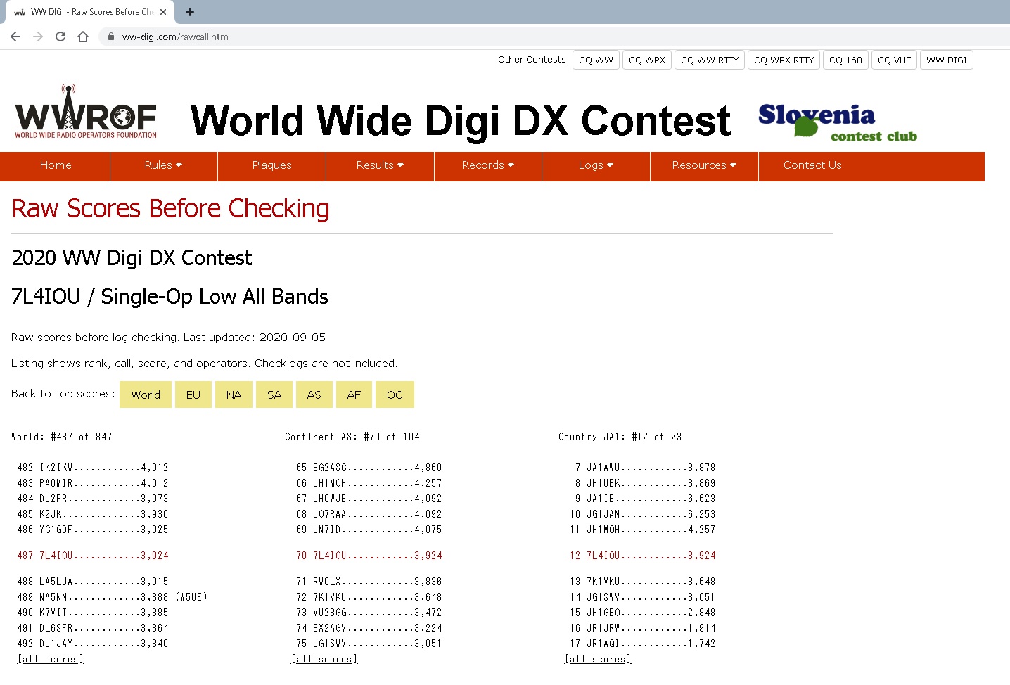 これからという時間に、160mのアンテナを焼いてしまい、良いところ無しに終わったWW Digi DXですが、ログチェック前の生スコア(Raw Scores)が公開されたとの事。
