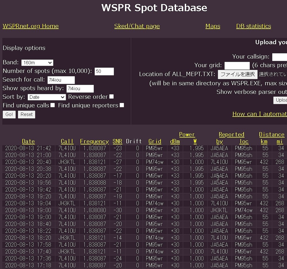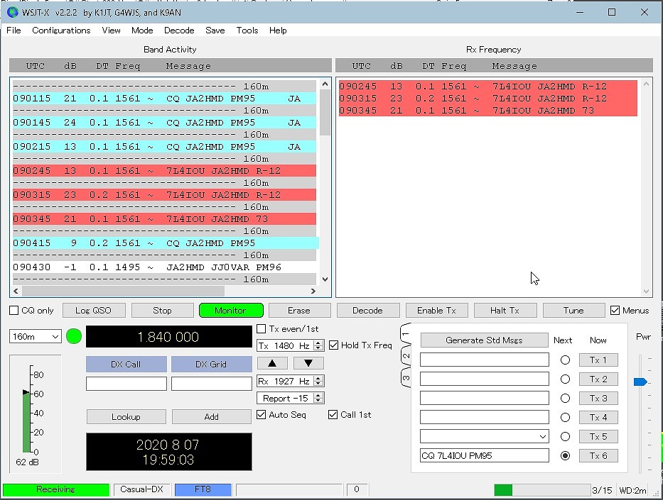 WSPR用に設定していたせいか、自分のメッセージが見えませんね。hi