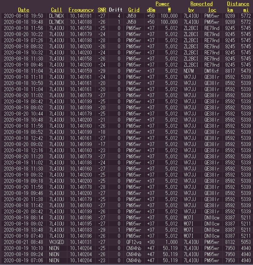 3~4日まえから10MHzのWSPRを運用中ですが、直近のレポートはこんな感じです。