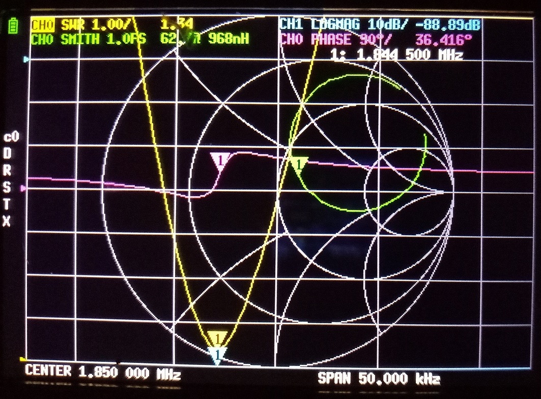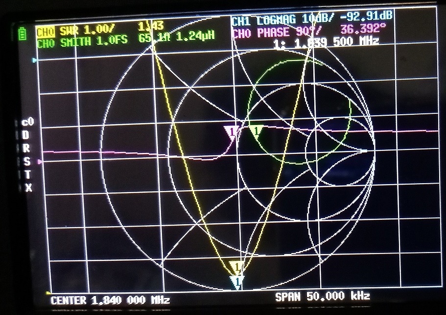 バリコンを挟み込んで、所望の周波数(今回は1.840MHz)に同調させました。